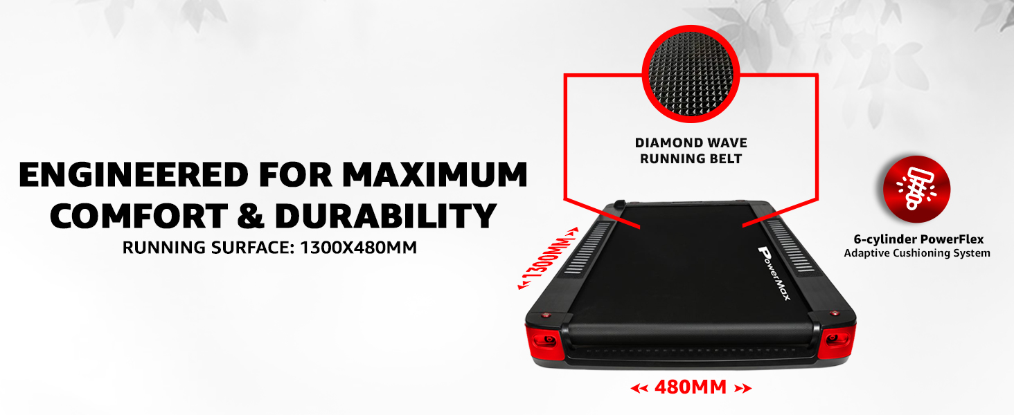 Experience a capacious running environment with a 1300 X 480mm running area and the 6-Ply Commercial Orthopedic friendly, Diamond Wave Treadmill Belt. The PowerFlex Adaptive Cushioning System reduces impact by up to 25%, ensuring a comfortable and safe workout.