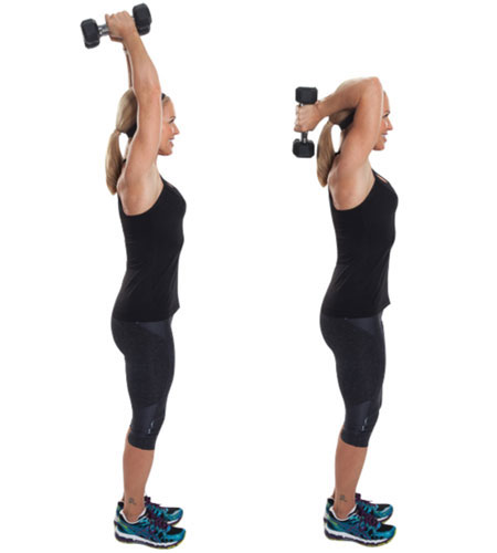 2. Triceps extensions - Triceps extensions are an excellent exercise to work out your triceps. To perform a triceps extension hold the dumbbells up over your head then, bending your arm at the elbow, make sure your arms are close to your ears and not flopping around, keep them straight when you come up and keep the elbows firm. You can do this exercise for 3 sets with 12-15 repetitions each.