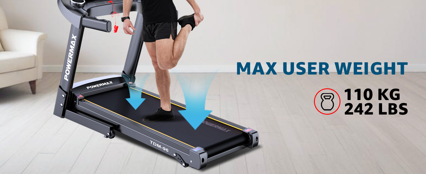 A choice aligned with you. With a maximum user weight capacity of 110kg, the MaxTrek TDM-96 Motorized Treadmill accommodates various users. For enhanced longevity and performance, Powermax recommends factoring in an additional 25 Kg buffer for running. Consider your weight as a reference point when selecting the treadmill's capacity. For example, if your weight is 85kg or less, a 110 KG max capacity treadmill is suitable.