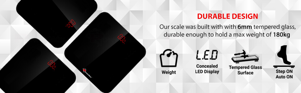 Its low-profile tempered glass platform makes it strong enough to bear the weight of up to 180KG. The scale features auto on/of function therefore no on/off button is provided.