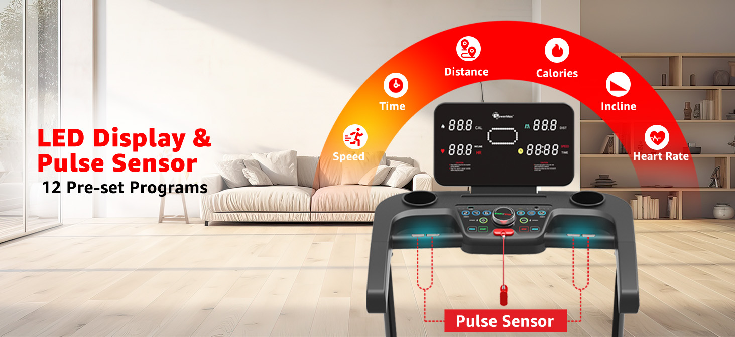 The PowerMax TDA-230® is the perfect combination of performance, comfort, and smart functionality for home workouts. It features a powerful 5.0HP DC motor, pulse sensors, and a strong frame that supports users up to 140 KG. The sleek design, easy-to-read LED console, and compact foldable frame make it an excellent choice for every fitness level.